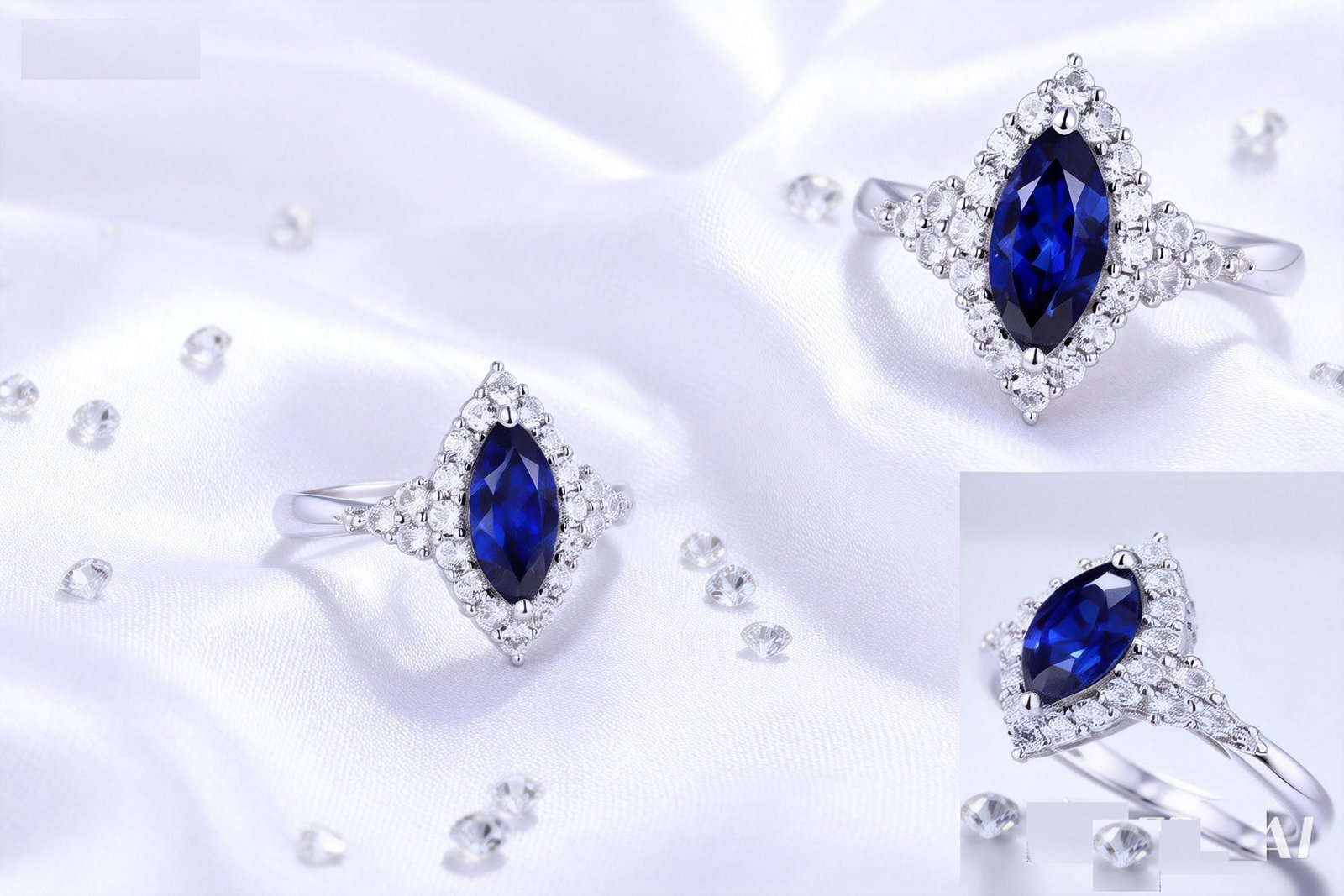 Created Blue sapphire marquise shape and Lab grown diamond ring in 925 silver, diamond total:1/2ct.